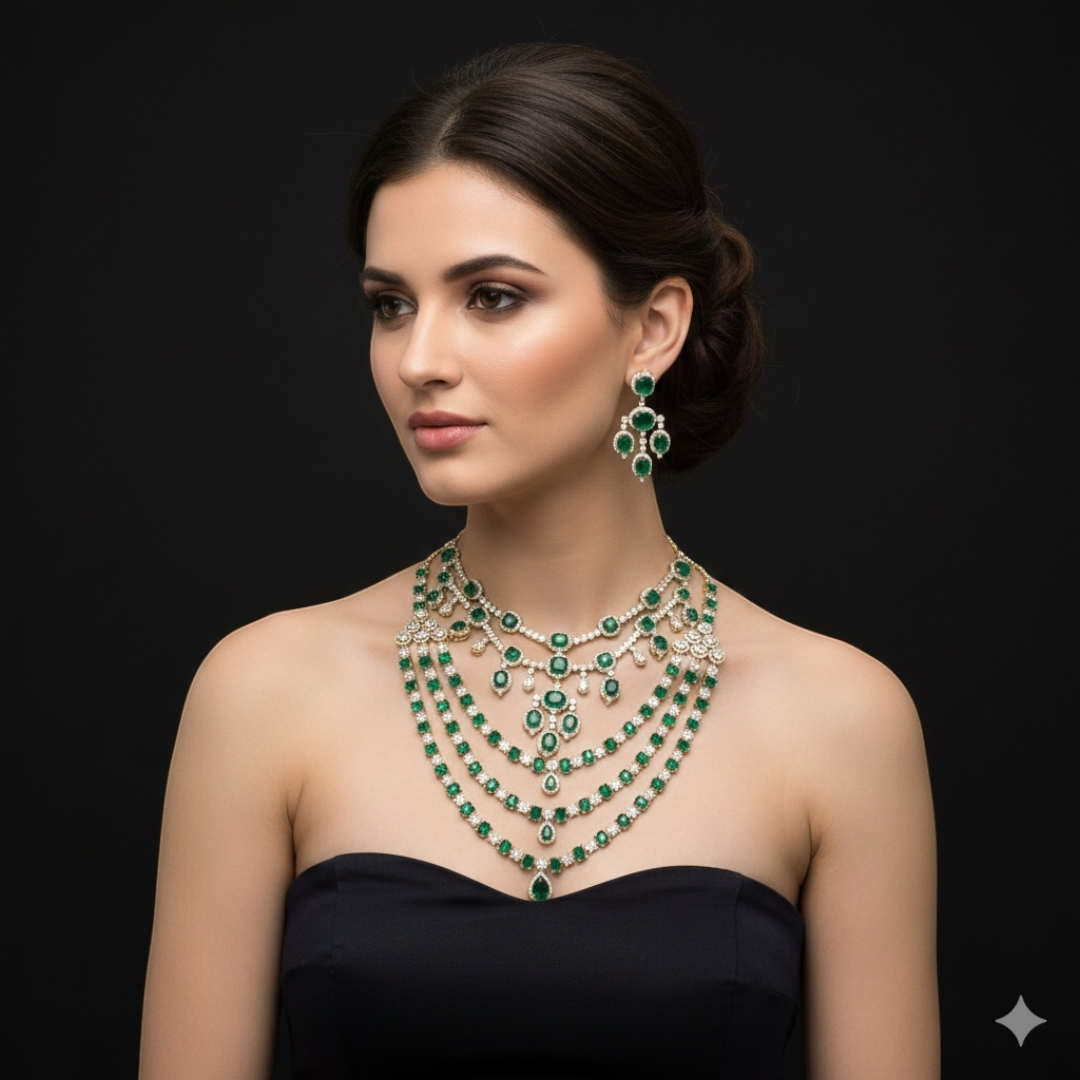 American Diamond Necklace Set with Earrings - Two Necklace Sets - Emerald Green (Panna)American Diamond Necklace Set with Earrings – Two Necklace Sets – Emerald Green (Panna)
