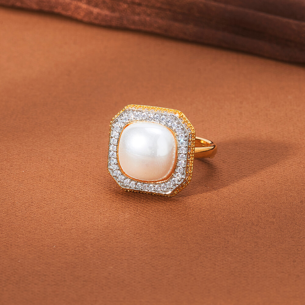 CZ Ladies Finger Ring with Off White Pearl – Adjustable Design Concept – Two Tone Polish – KJ108788