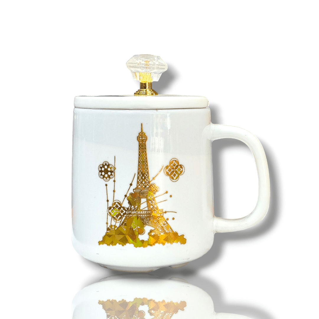 Eiffel Tower Printed – Paris Theme – White Ceramic Mug with Lid and Steel Spoon