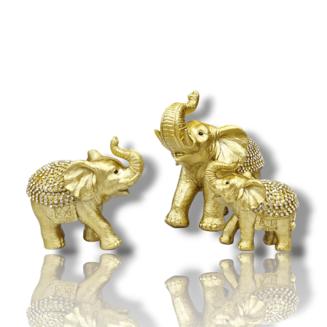 Elephant Family - Set of 3pcs - Golden Polish - Diamond Studded Show PieceElephant Family – Set of 3pcs – Golden Polish – Diamond Studded Show Piece