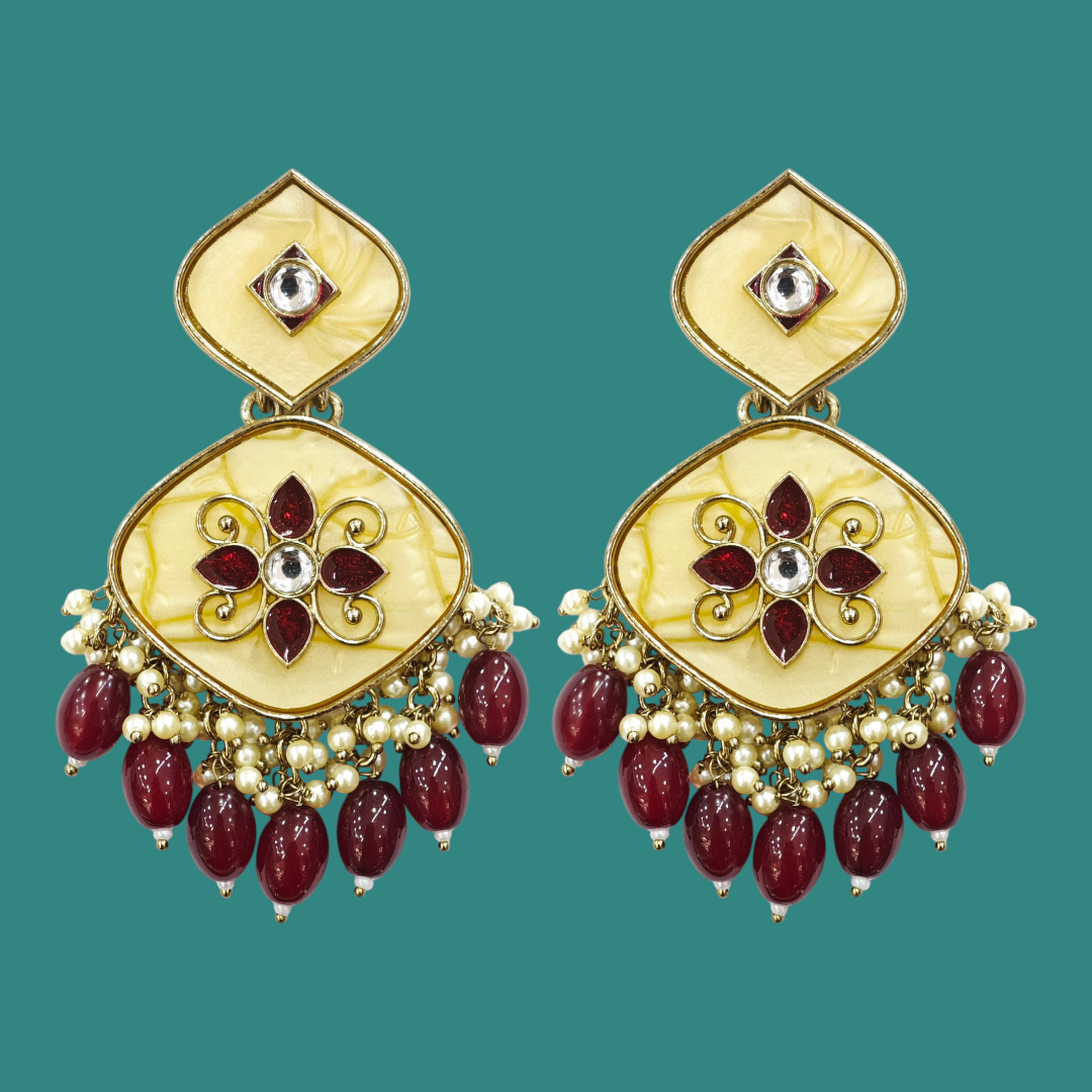 Ethnic Earrings – Acrylic MOP – Intricate Kundan Work – Maroon Beads with Pearls – KJ10777Availability: 1 in stock