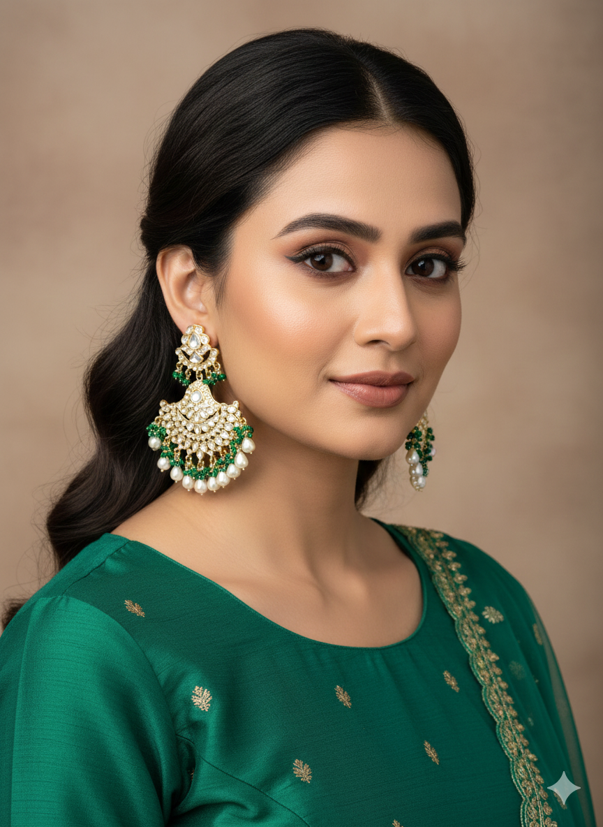 Green – Signature Kundan & Pearl with Bottle Green Chaand Bali Earring – KJAvailability: 1 in stock