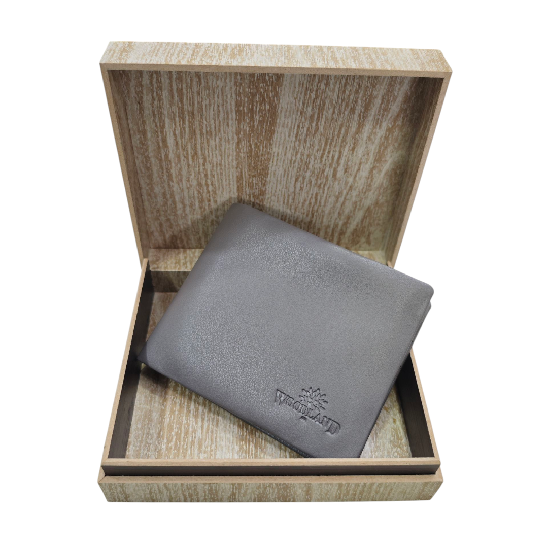 Mens Wallet – Wooden Box Packing – High Quality – Soft Vegan Leather Finish – WOODLAND – Light Grey