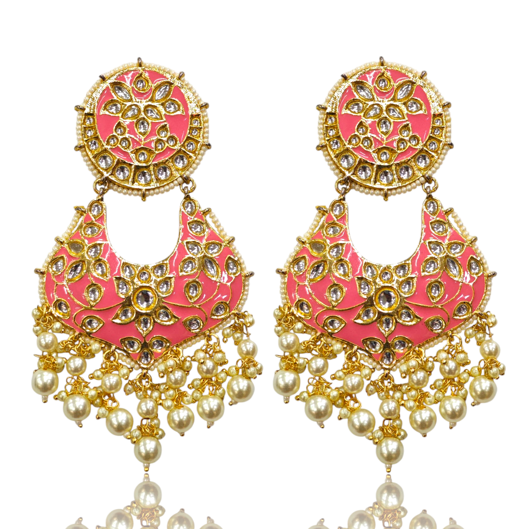 Pink Ethnic Earring – Kundan – Gold Polish – Enamel (Meenakari) & Pearls – KJ88892Availability: 1 in stock